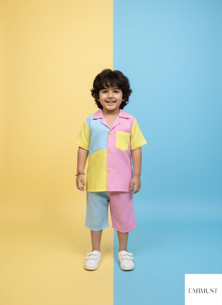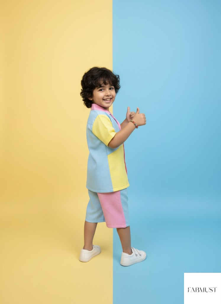 Colour block Cotton Candy Sky cord set for boys. Button down shirt with shorts. Soft, light & breathable fabric made for kids to look stylish while staying comfy!